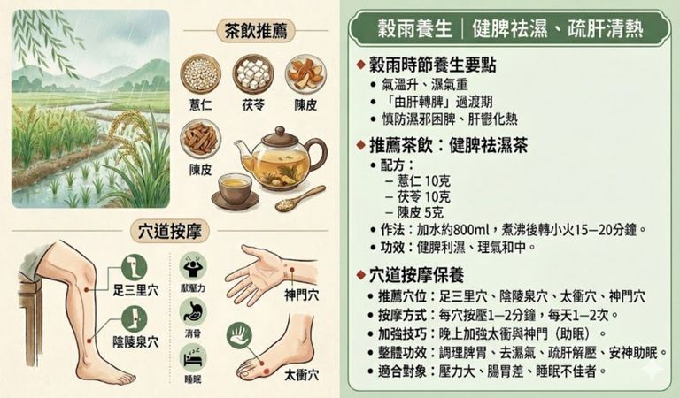 穀雨節氣到!中醫師表示,穀雨時節火氣漸旺濕氣漸重,若心火太旺或脾氣虛弱或運化功能不佳,便容易出現各種不適症狀,推介1茶飲4穴道健脾祛濕。